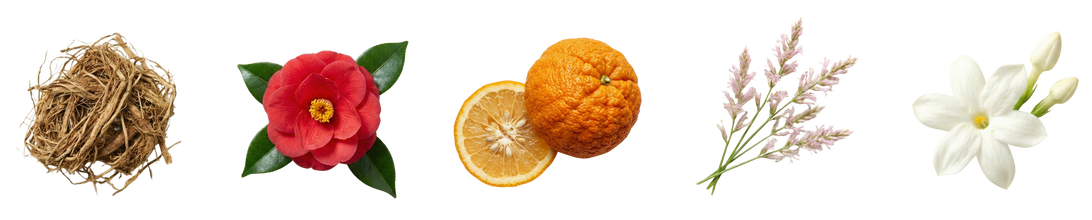 ベチベル根水:福岡県産 自然豊かな八女産のベチバーの根の蒸留水は奥深い大地の香りが特長です。お肌を保湿し落ち着かせます。 ツバキ種子油:佐賀県産 酸化・変質しづらく肌なじみが良い椿油はお肌の潤いとやわらかさを保つ効果があります。 透き通るような繊細なグリーンフローラル調の香りに仕上げました。 全成分:ベチベル根水・ツバキ種子油・コメヌカ油・ベントナイト・パルマローザ油・ビターオレンジ油・ジャスミン油・香料 自然由来指数100%(ISO16128準拠 水を含まない)